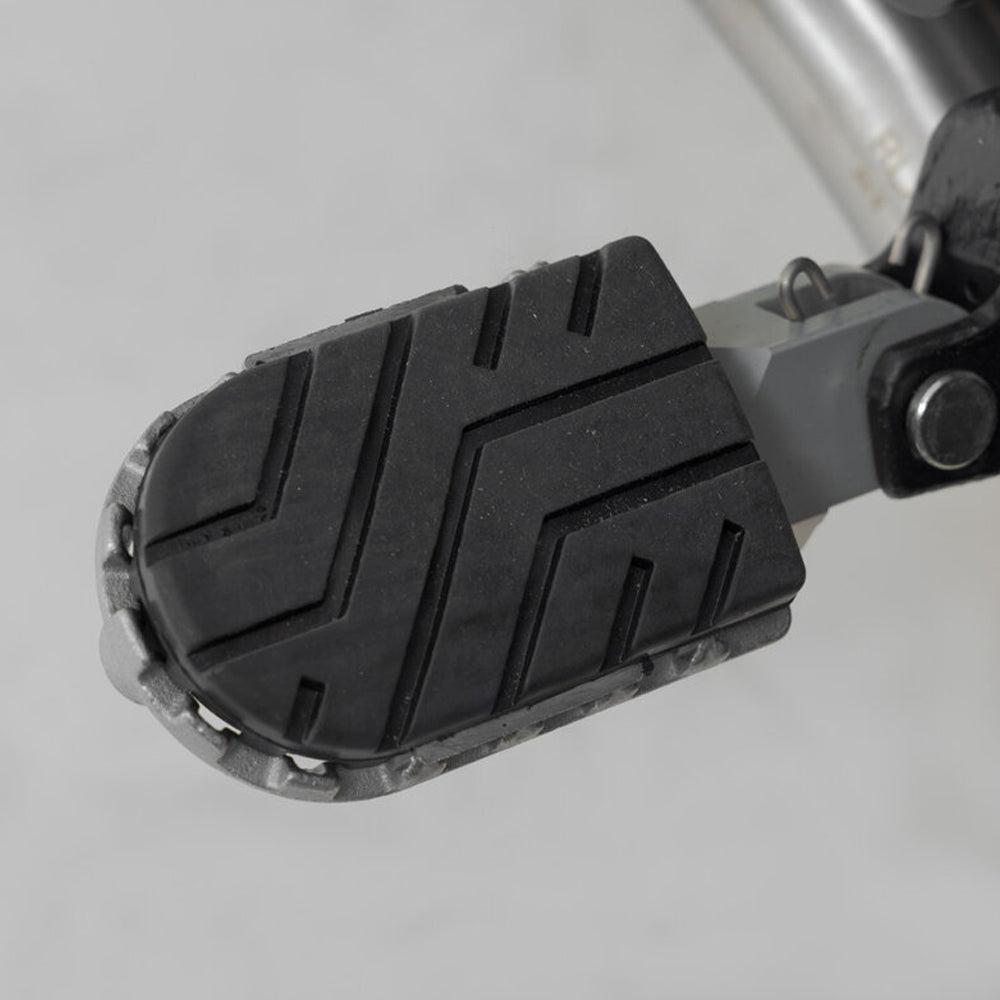 Our reasonably priced ION footrest kits allow the footrest to be mounted at its original height or lowered by 15 mm. Extremely durable and built to last, these stainless-steel footrests provide plenty of extra grip and are recommended for adventure, offroad and urban motorcycles. Hinges made from high-strength aluminum alloy ensure that the footrest can fold out of the way if the bike tips over. The removable rubber top surface reduces vibration, and the profile gives you a firm grip during offroad riding. To mount the bike-specific hinge adapter to the footrest sockets, the original attachments (springs, bolts, etc.) are used.