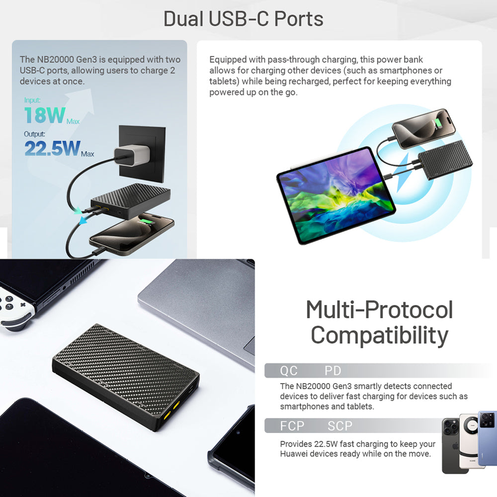 Its 3x USB/USB-C QC output ports are compatible with a variety of electronics and allow you to fast charge electronics. The USB-C output port has been upgraded to 45W making this the ultimate laptop/notebook companion charger. For delicate devices such as Bluetooth headphones and smartwatches, NB20k has a one-touch low current mode.