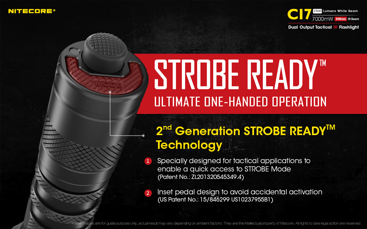 The white beam of the CI7 utilizes 4 x CREE XP-G3 S3 LEDs with a lifespan of 50,000 hours. It can emit a max output of 2,500 lumens and a max throw of 279 meters, ready to meet different tactical needs in all kinds of harsh environments.
