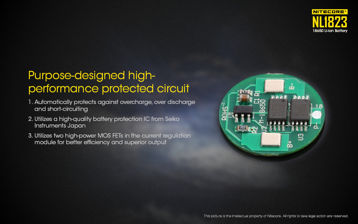 This 3.7V, 2300mAh 18650 Li-Ion Rechargeable Battery from Nitecore has been specifically designed for use in high-drain devices, and features integrated overcharge and over discharge protection circuitry which reduces the risk of damage to the battery. Its positive terminal is a conventional 'button' configuration to be compatible with most devices.